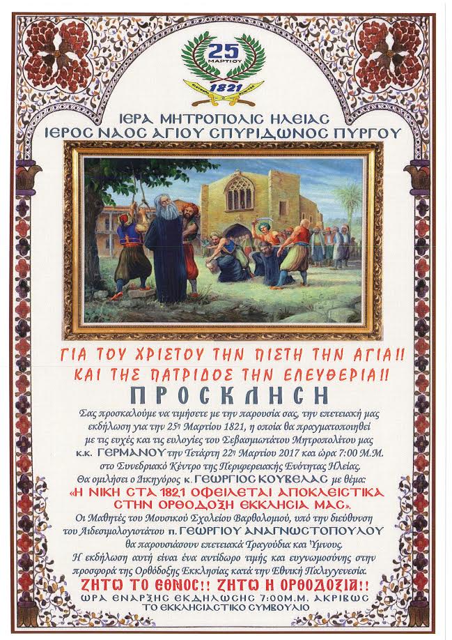 Με μεγάλη επιτυχία πραγματοποιήθηκε χθες 22/03/2017 και ώρα 1900, η Επετειακή Eκδήλωση για την 25η Μαρτίου που διοργανώθηκε από τον Ιερό Ναό Αγίου Σπυρίδωνος Πύργου.