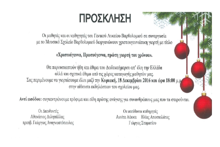Το Γενικό Λύκειο Βαρθολομιού σε συνεργασία με το Μουσικό Σχολείο Βαρθολομιού διοργανώνουν Χριστουγεννιάτικη εκδήλωση την Κυριακή 18 Δεκεμβρίου 2016 και ώρα 1800 στην αίθουσα εκδηλώσεων του Γενικού Λυκείου, με παρουσίαση ηθών και εθίμων του δωδεκαημέρου απο την Ελλάδα αλλά και τις χώρες καταγωγής των μαθητών μας. Την γιορτή πλαισιώνουν με παραδοσιακά κάλαντα απ' όλη την Ελλάδα, 10 μελής Ορχήστρα και 15 μελής Χορωδία του Μουσικού Σχολείου. Αντί εισοδου συγκεντρώνονται τρόφιμα και είδη πρώτης ανάγκης για τους συνανθρώπους μας που τα στερούνται. Σας περιμένουμε όλους.